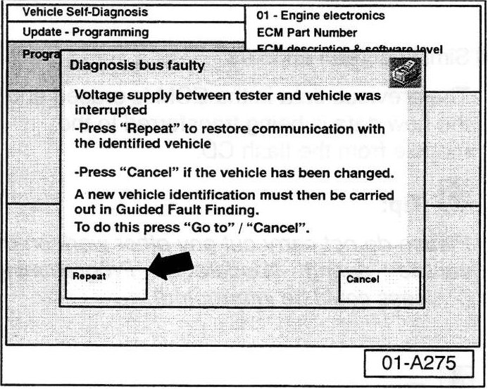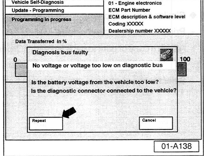 - The "Update - Programming" process must then be started from the beginning using the "Repeat" button (arrow). DO NOT use the "Cancel" button.