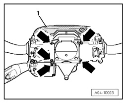 - Carefully release clip fasteners - arrows - and remove spiral spring - 1 - from steering column switch module.