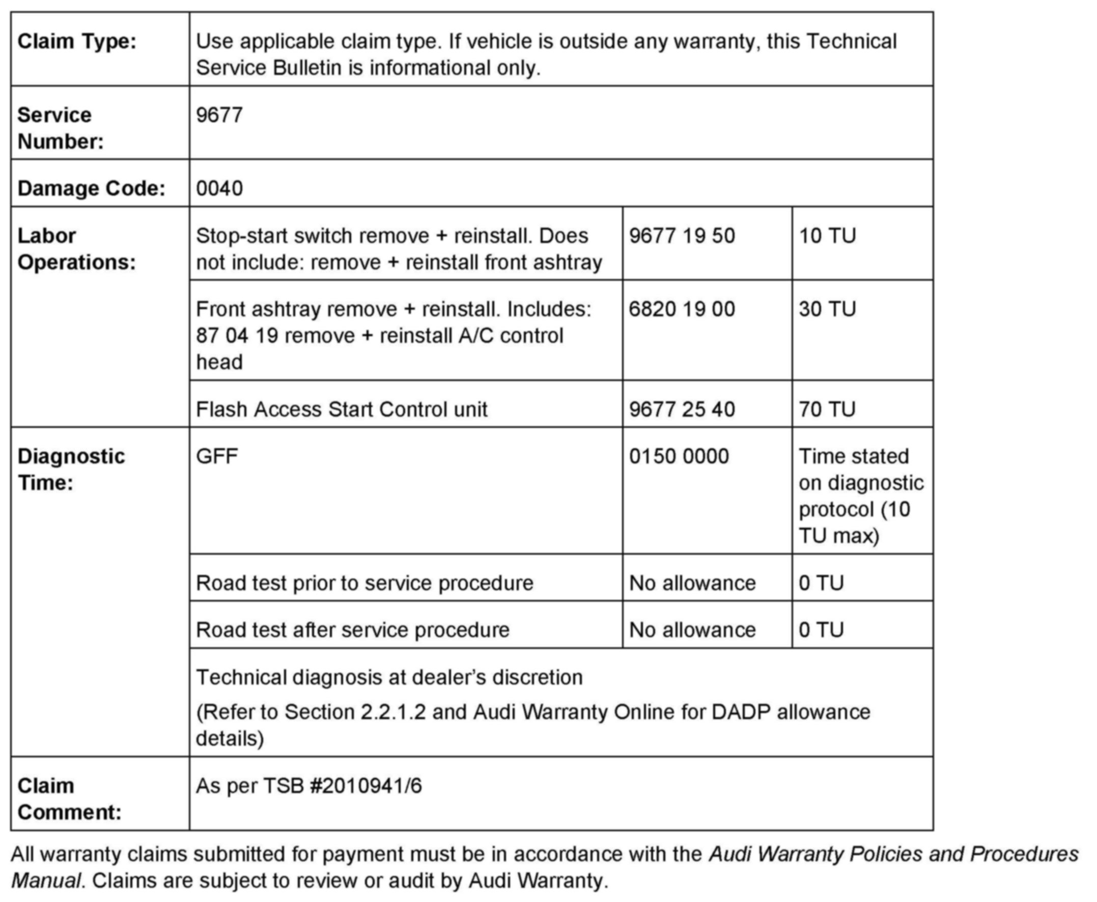 Tip: If the vehicle exhibits battery discharging and the diagnosis of the engine start / stop button is determined to be a software issue based on the criteria in section B - Electrical issue with the engine stop button, please perform update flash as outlined in TSB 2019143. Otherwise proceed with this TSB.