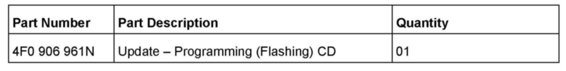 Additional copies of the "Update Programming" (Flashing) CD (Part No: 4F0 906 961N) may be ordered through normal parts processing.