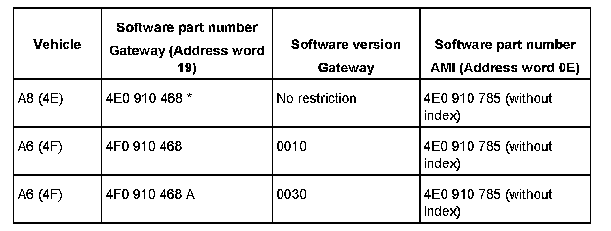 The unjustified fault entry is only possible in the following Gateway / Audi Music interface configurations: