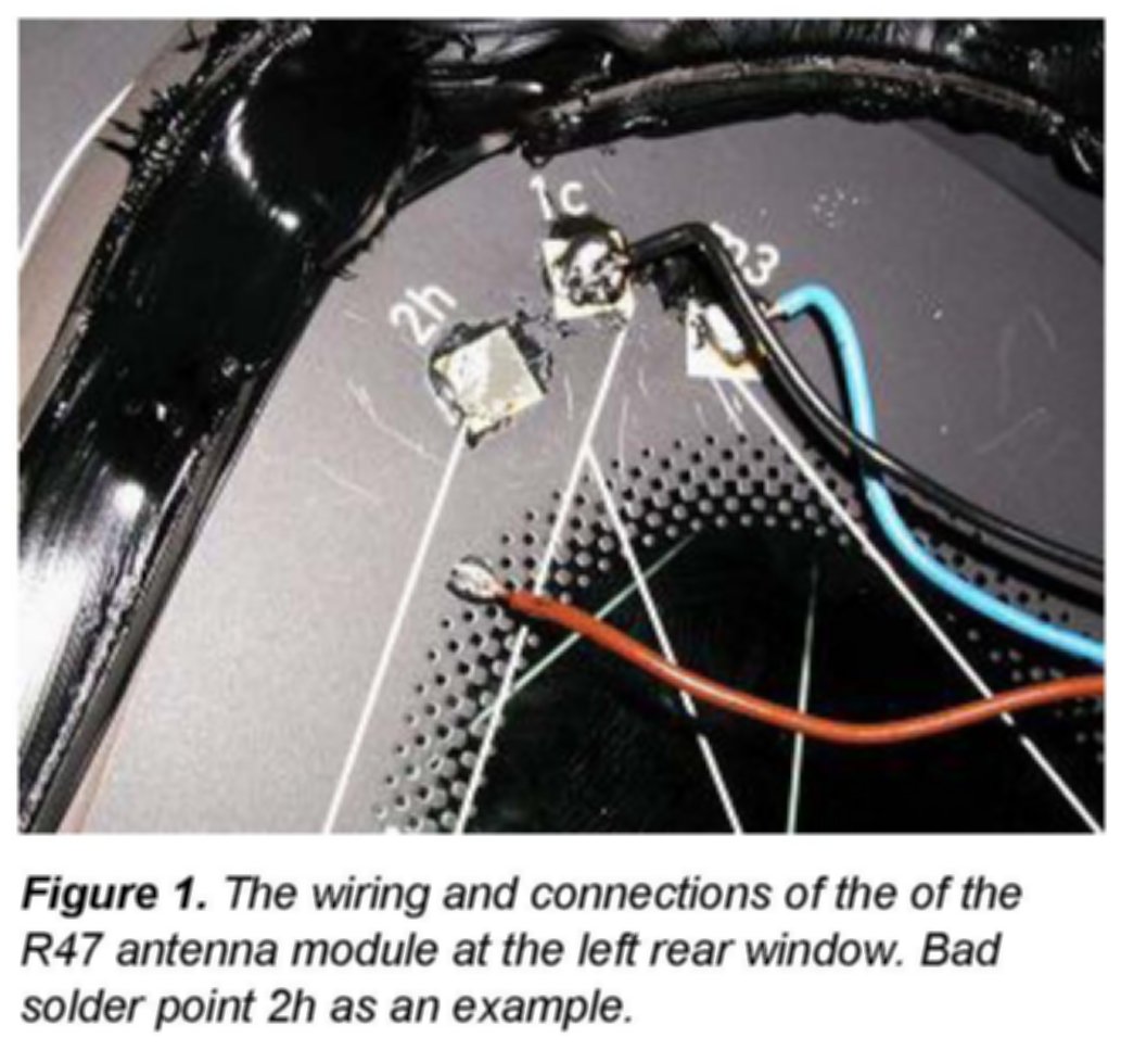 Inspect the wiring and connections of the R47 antenna module at the left rear side window (Figure 1).