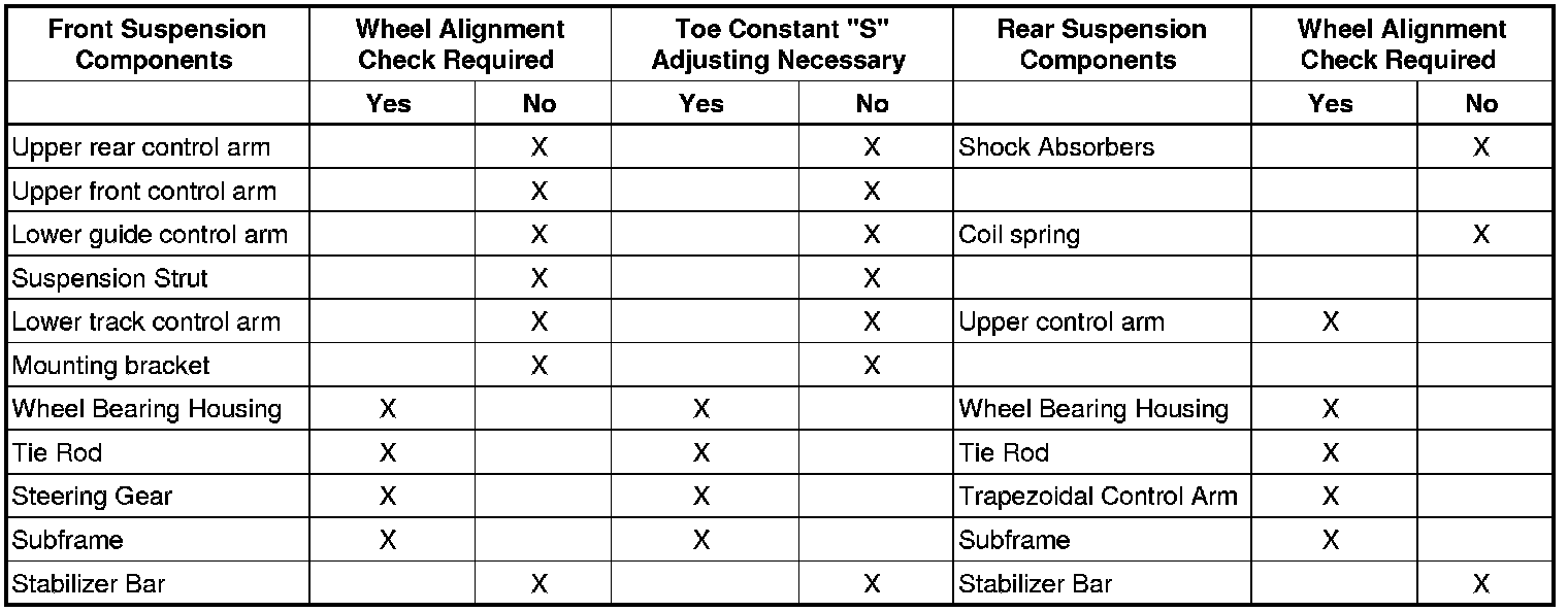 • Axle alignment should not be performed until the vehicle has been driven 1,000-2,000 km, since it takes this long for the suspension to settle.