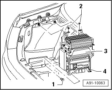 - Loosen nuts - 2 - and - 4 - (5 Nm) and screw - 1 - (5 Nm) on Infotainment rack - 3 -.