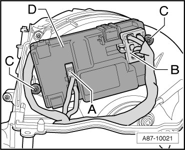 - Disconnect connectors - A - (to the Fresh Air Blower (V2) and - B -.