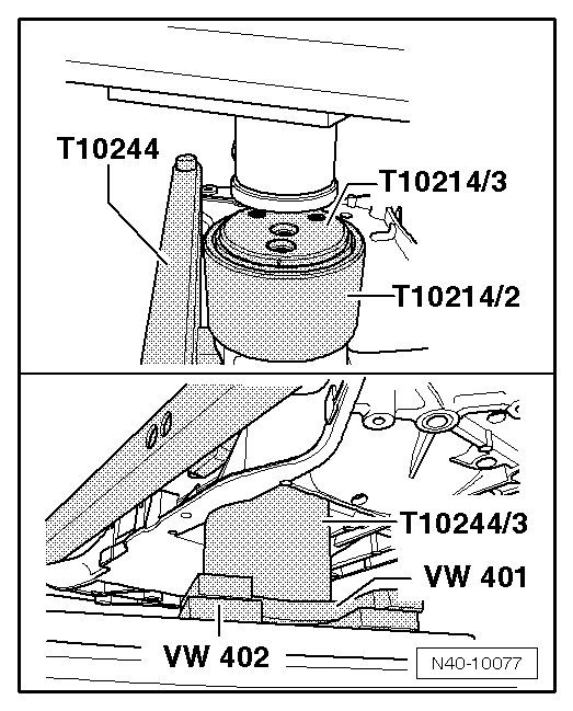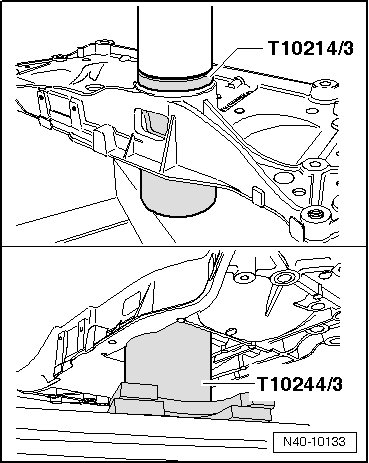 - Align (T10214/2) with pressed in bonded rubber bushings onto subframe. While doing this, the corners of the inner core must be parallel to the edge of the (T10244).