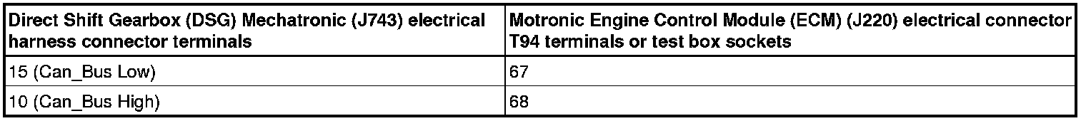 - Using a Multimeter, check the Direct Shift Gearbox (DSG) Mechatronic (J743) electrical harness connector to the Motronic Engine Control Module (ECM) (J220) electrical harness connector T94 for resistance.