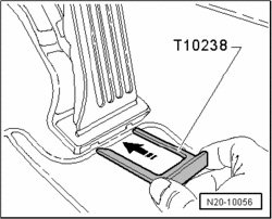 - Push release tool T10238 into intended openings - arrow - up to stop, as shown, and remove accelerator pedal module.
