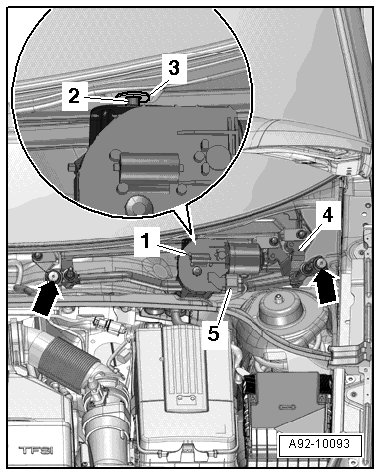- Install the wiper frame - 1 - with linkage and the wiper motor into the plenum chamber; when doing this, the retaining pin - 3 - must fit into the mount - 4 - on the body - arrow -.