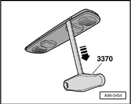 - Carefully remove rear interior lamp module from headliner opening using hook 3370 as illustrated.