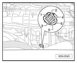 - Using a Multimeter, check the Throttle Drive (for Electronic Power Control (EPC)) G186 at the Throttle Valve Control Module J338 electrical harness connector terminals 2 to 6 for voltage.