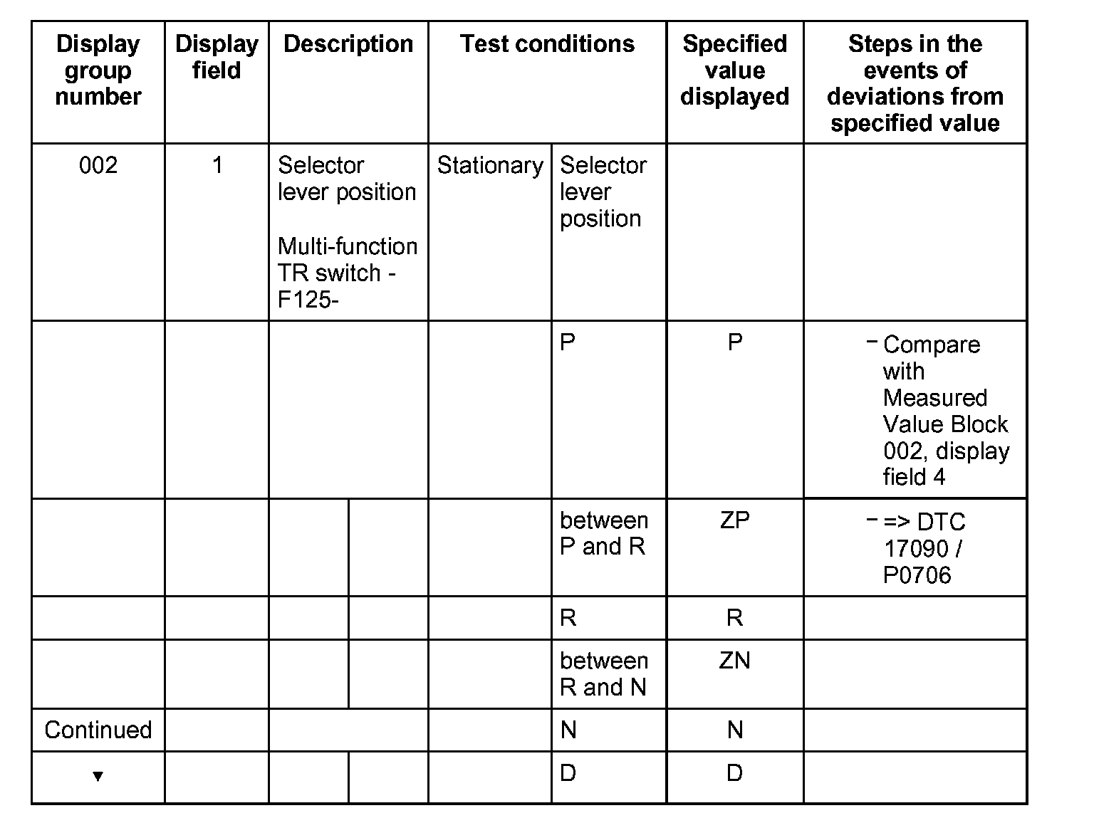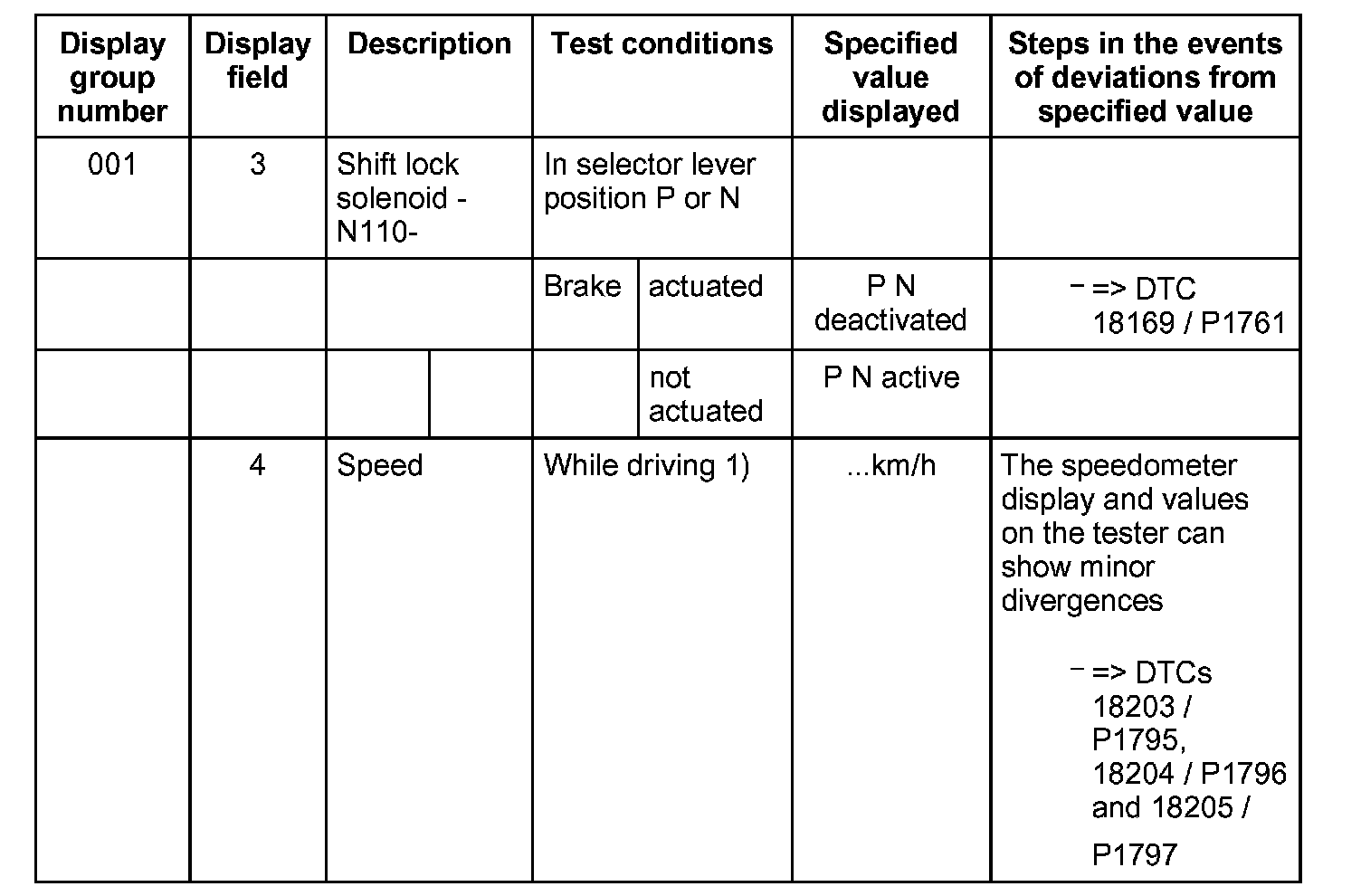 Measured Value Block table - 01J, Continuously Variable Transmission (CVT)