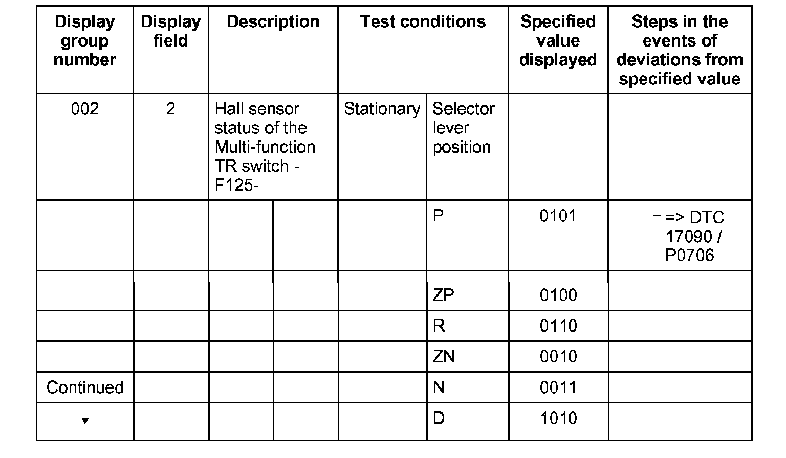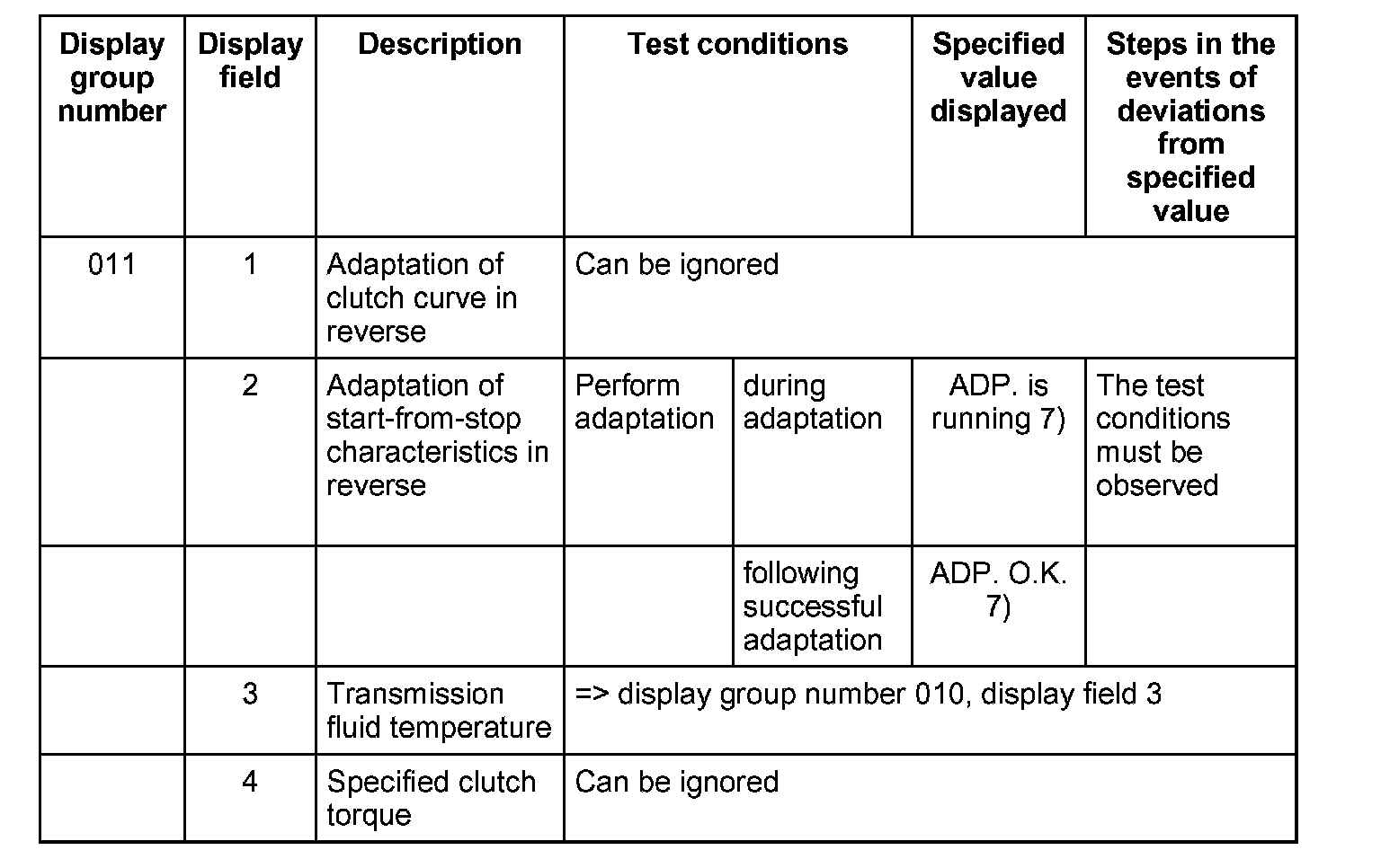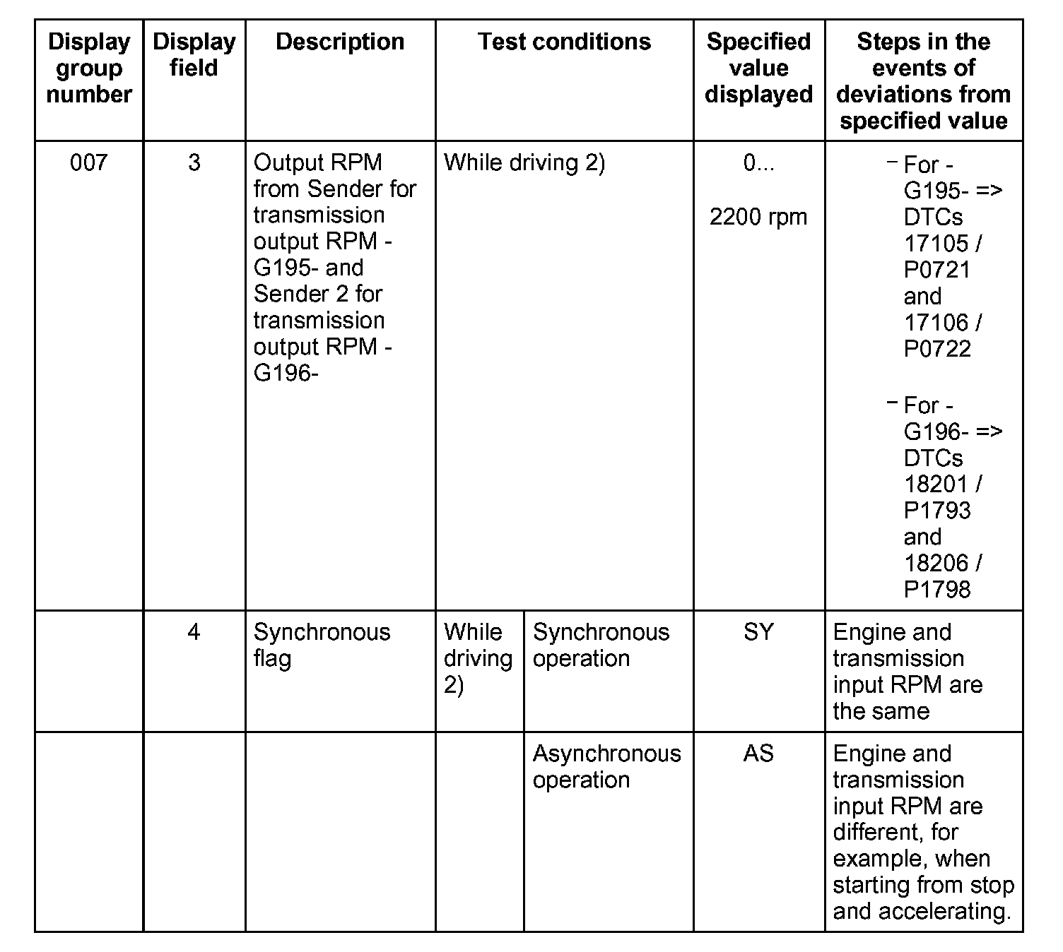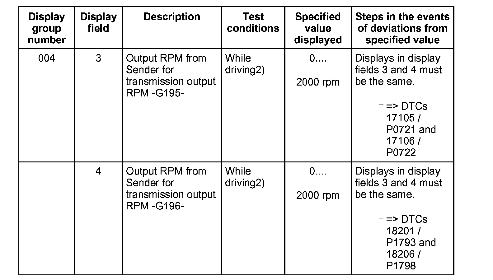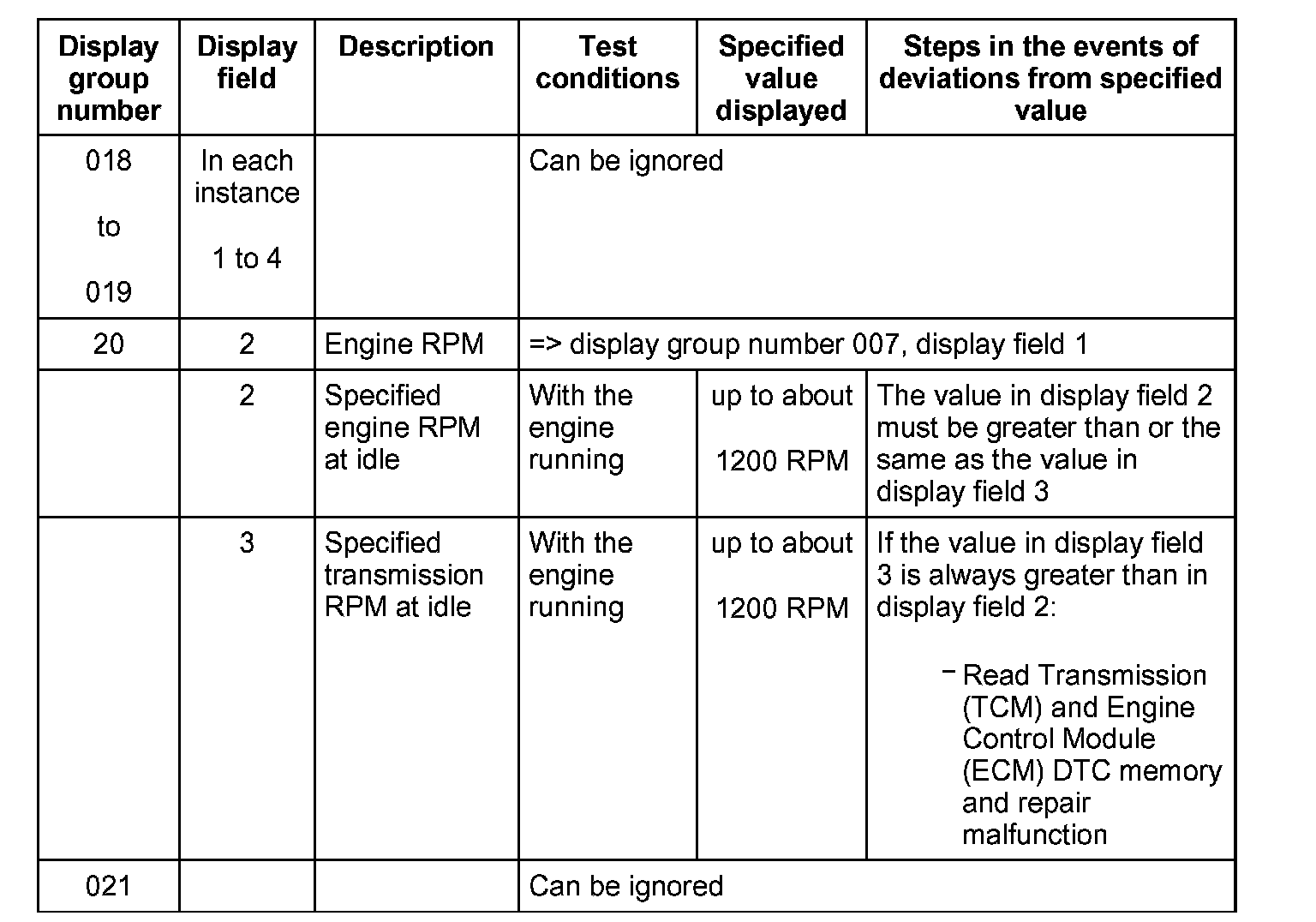 ^ If "0 RPM" is shown in display field 3 or 4, the corresponding sender is faulty and the Transmission Control Module (TCM) must be replaced.