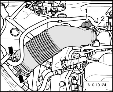 - Remove air duct hose, thereby loosening hose clamp - 2 - and opening clips - arrows -.