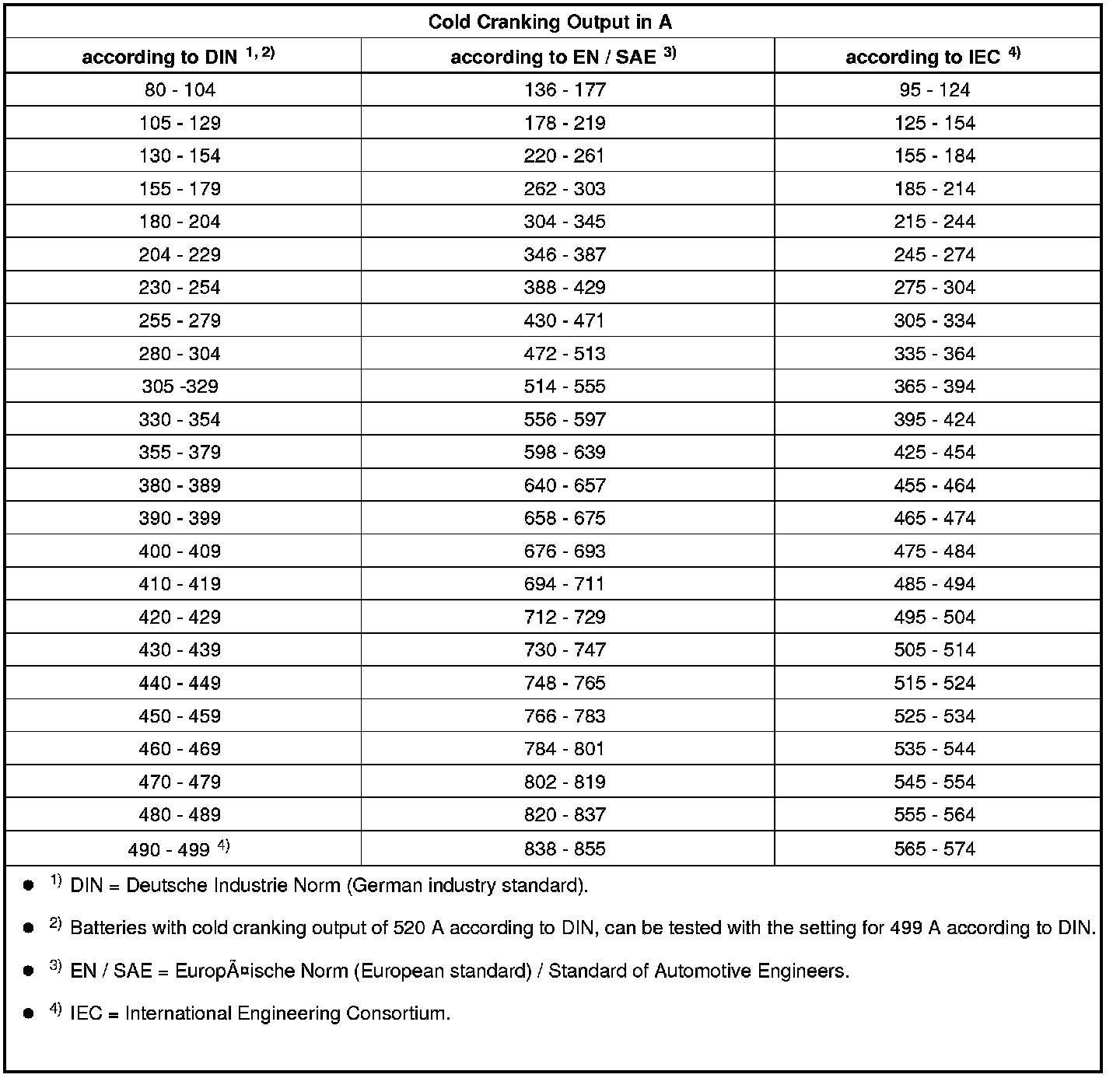 • Batteries with cold cranking output of 520 A according to DIN can be tested with the setting for 499 A according to DIN.