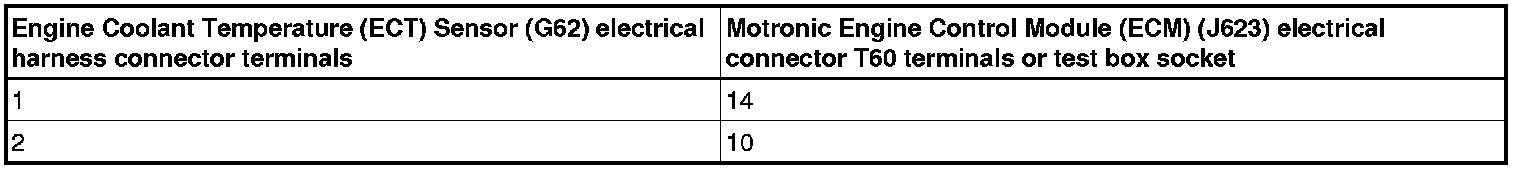 - Using a Multimeter, check the Engine Coolant Temperature (ECT) Sensor ( G62) electrical harness connector terminals to the Motronic Engine Control Module (ECM) (J623) electrical harness connector T60 terminals for an open circuit according to the wiring diagram.