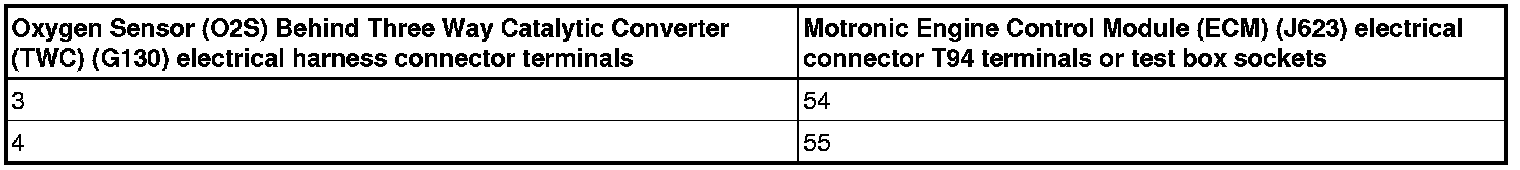 - Using a multimeter, check the Oxygen Sensor (O2S) Behind Three Way Catalytic Converter (TWC) (G130) electrical harness connector terminals to the Motronic Engine Control Module (ECM) (J623) electrical harness connector T94 terminals for an open circuit according to the wiring diagram.