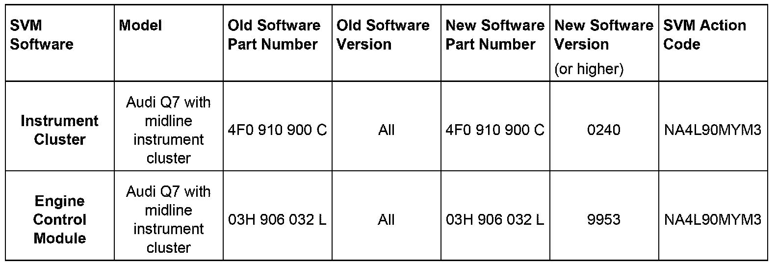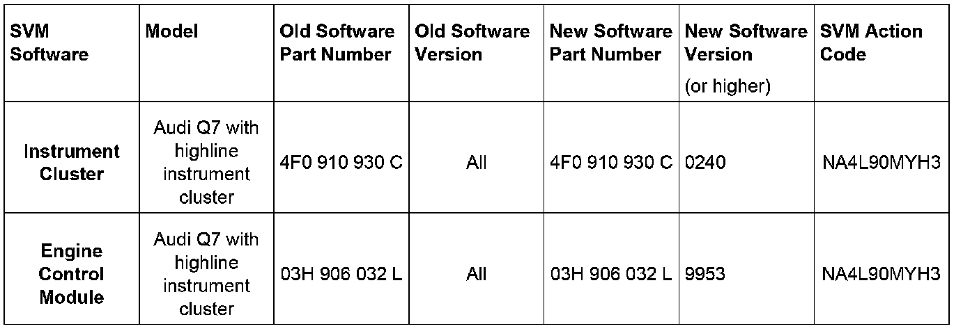 ServiceUpdate the instrument cluster (J285) and/or the engine control module (J623) using the SVM Action Code as listed in the table below.