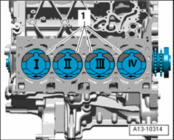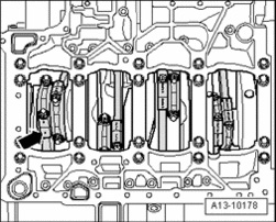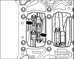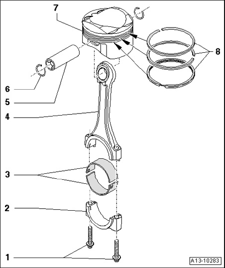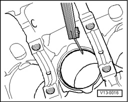 - Before removing, mark allocation of connecting rod and connecting rod bearing caps to each other and to cylinder with paint - arrow -.