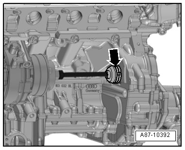 - Slide the dust cap - arrow - onto the end of the shaft for the A/C compressor drive spur gear with the hose clamp already installed and secure it.