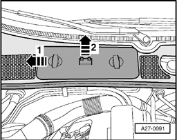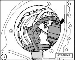 - Remove the wiring harness and the electrical harness connector - arrow - from locking flange opening and position aside.