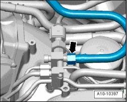 - Disconnect the fuel line at the fuel rail - arrow -.