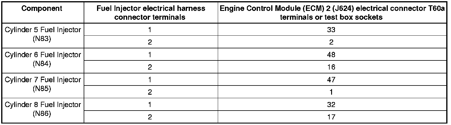 The following test procedure is used to diagnose all fuel injectors controlled by the Engine Control Module (ECM) 2 (J624).