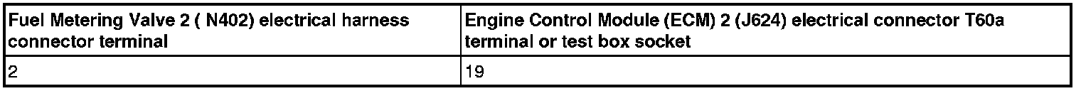- Using a multimeter, check the Fuel Metering Valve 2 (N402) electrical harness connector terminal 2 to the Engine Control Module (ECM) 2 (J624) electrical harness connector T60a terminal 35 for an open circuit.