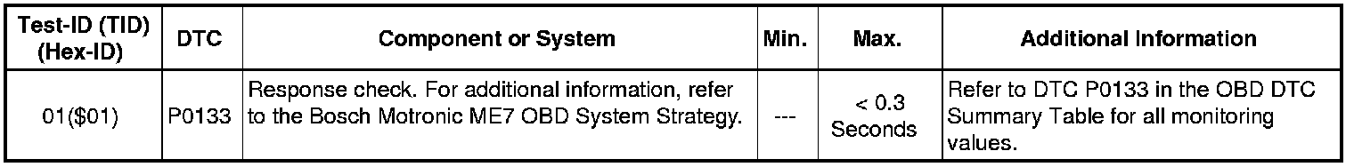 • Depending on scan tool and protocol used, the information in diagnostic mode 01 may be referred to by different names such as Test-ID (TID), Hex-ID, Component-ID (CID), or On-Board Diagnostic Monitor Identifier (OBDMID).