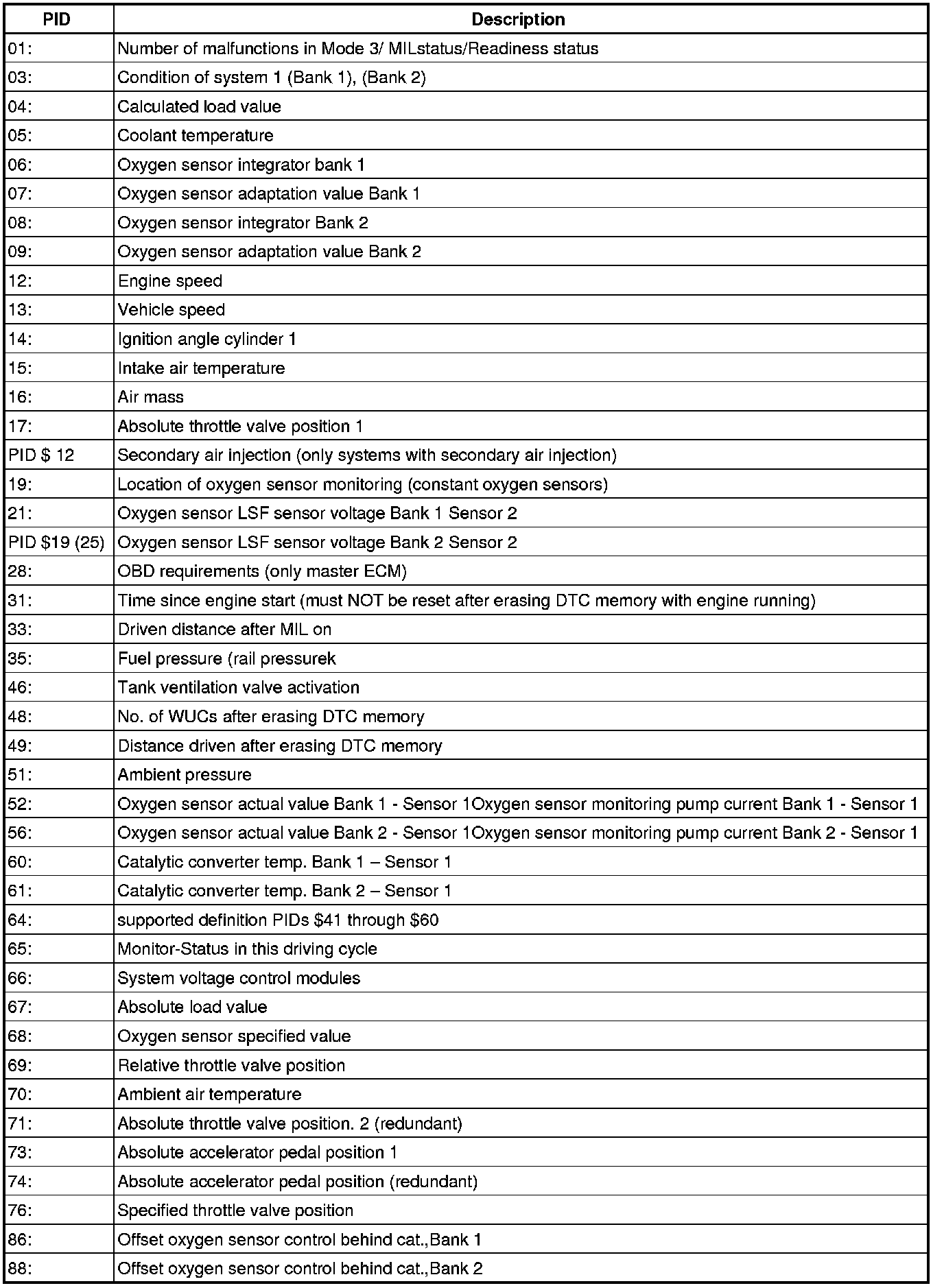 - From the following table, select the desired the "PID" that is to be monitored, e.g. "PID 05-Coolant temperature".