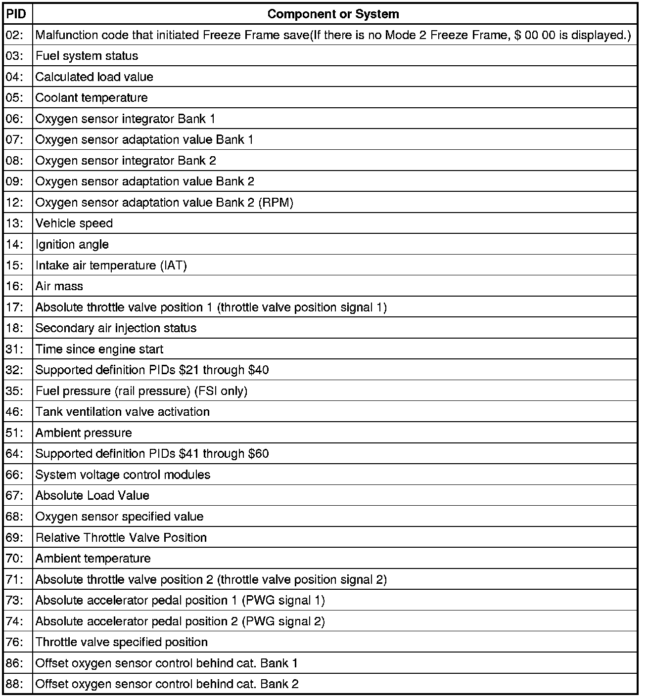 • Depending on scan tool and protocol used, the information in diagnostic mode 02 may be referred to by different names such as Test-ID (TID), Hex-ID, Component-ID (CID), or On-Board Diagnostic Monitor Identifier (OBDMID).
