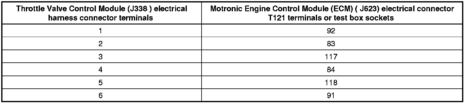 - Using a Multimeter, check the Throttle Drive (for Electronic Power Control (EPC)) (G186) at Throttle Valve Control Module (J338) electrical harness connector terminals to the Motronic Engine Control Module (ECM) (J623) electrical harness connector T121 terminals for an open circuit.