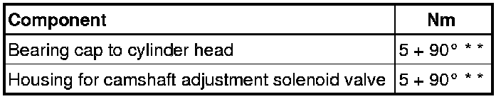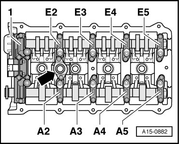 Tighten bearing caps - E2 -, - E4 -, - A2 - and - A4 - for intake and exhaust camshafts, alternating and in diagonal sequence.