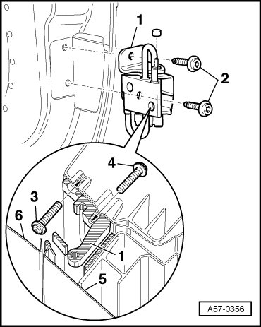 - Torx bolt - 4 - (T45) bolted to - A - pillar from interior of vehicle (32 Nm).