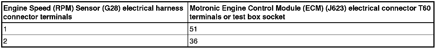- Using a multimeter, check the Engine Speed (RPM) Sensor (G28) electrical harness connector terminals to the Motronic Engine Control Module (ECM) (J623) electrical harness connector T60 terminals for an open circuit.