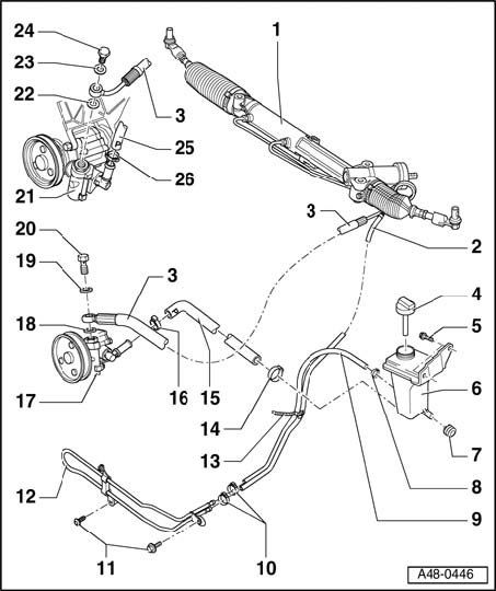 ^ If the fluid level in the reservoir is low, the steering system must be inspected for leaks.