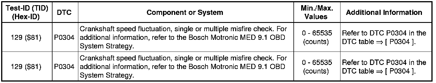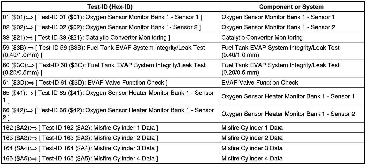 • Depending on diagnostic tester and protocol used, the information in diagnostic mode 01 may be referred to by different names such as Test-ID (TID), Hex-ID, Component-ID (CID), or On-Board Diagnostic Monitor Identifier (OBDMID).