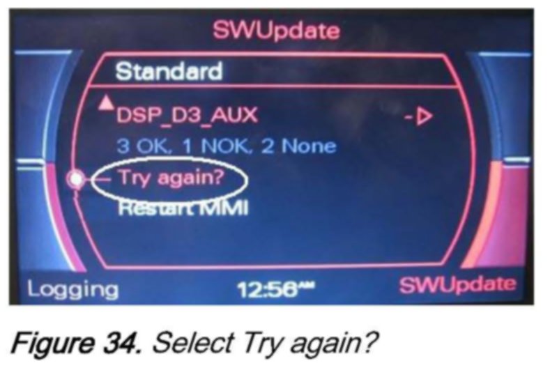2. Wait 30-60 seconds until the MMI system recognizes the CD. Then access the red update menu (press and hold SETUP and RETURN buttons) and select the function SW Update with the lower right soft button.