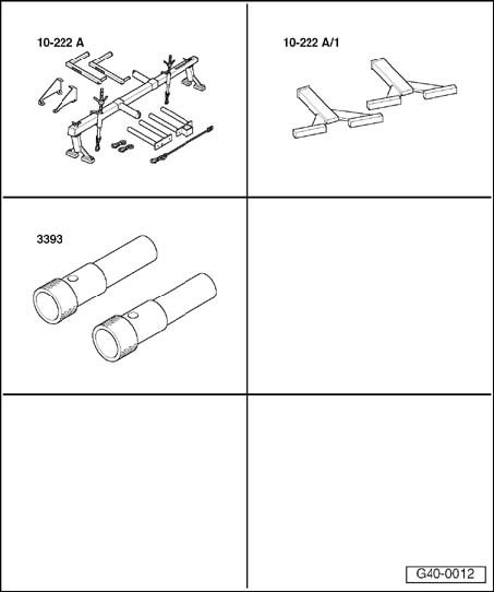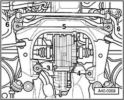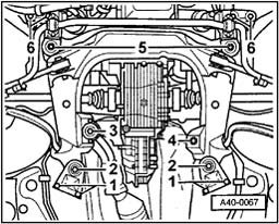 - Place engine/transmission jack V.A.G 1383 A with wooden block under subframe and press lightly against.