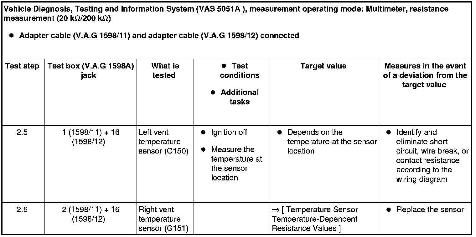 • The wire connection to these sensors ends at different connectors. Therefore use a second test box (V.A.G 1598A) or connect the measuring device with a suitable measuring lead from the connector test kit (V.A.G 1594C) directly to the adapter cable (V.A.G 1598/12)
