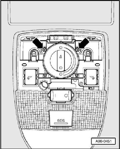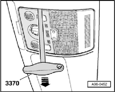 - Carefully remove interior lamp module trim using hook 3370 as illustrated - arrow -.