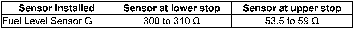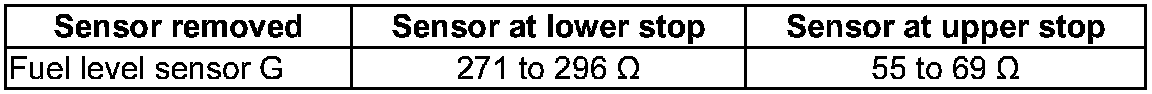 - With fuel level sensor G removed, the following values are obtained because of the greater deflection of the floater arm: