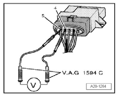- For voltage testing, connect multimeter with measuring probes and connector adapters from connector test set V.A.G 1594 C between clamp - 4 - and - 5 -, as shown in illustration. The electrical connection remains connected.