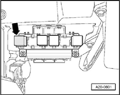 - Vehicles with MPI engine: Fuel Pump (FP) Relay J17 - arrow - at position 1 in 9-socket relay carrier behind driver side storage compartment is OK.