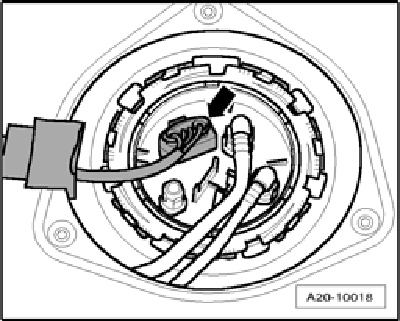 - Disconnect the electrical harness connector - arrow - at the right locking flange.