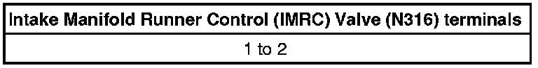 - Using a Multimeter, check the Intake Manifold Runner Control (IMRC) Valve (N316) terminals 1 to 2 for resistance