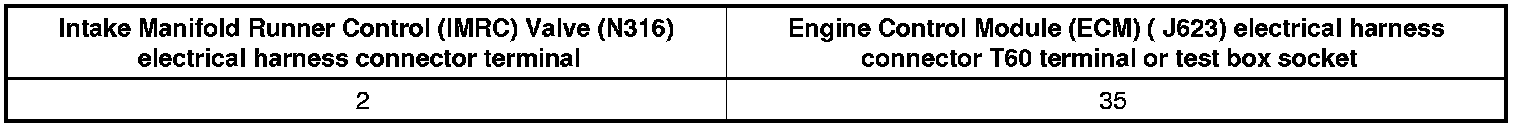 - Using a multimeter, check the Intake Manifold Runner Control (IMRC) Valve (N316) electrical harness connector terminal 2 to the Engine Control Module (ECM) (J623) electrical harness connector T60 terminal 35 for an open circuit.