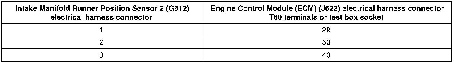 - Using a multimeter, check the Intake Manifold Runner Position Sensor 2 (G512) electrical harness connector terminals to the Engine Control Module (ECM) ( J623) electrical harness connector T60 terminals for an open circuit.
