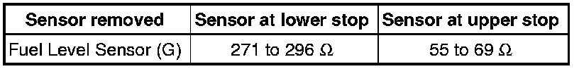 • With Fuel Level Sensor (G) removed, the following values are obtained because of the greater deflection of the floater arm: