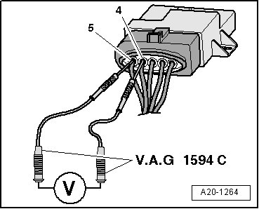 - For voltage testing, connect the multimeter with measuring probes and connector adapters from the Connector Test Set (V.A.G 1594C) between clamp - 4 - and - 5 -, as shown in the illustration. The electrical connection remains connected.